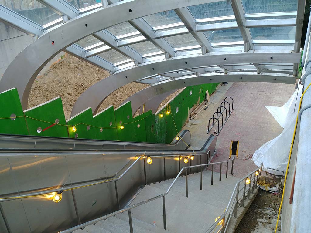 The new canopy covering an escalator and stairs from the bus bays on the North Kings Highway side of the Huntington Metro station. (Photo courtesy of Mark J. Colombo)